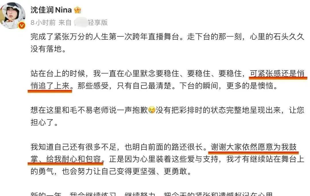 那晚事后,她发了条微博道歉,说“太紧张”“辜负了期待”。话是说得诚恳,可字里行间没提一句“练得不够”“功底不扎实”。倒是毛不易,自己唱功稳如老狗,结果还得在评论区安抚她:“舞台有遗憾很正常。”听着挺暖心,但细想又有点心酸——自己的歌被唱砸了,还要反过来哄人,这算什么事儿?